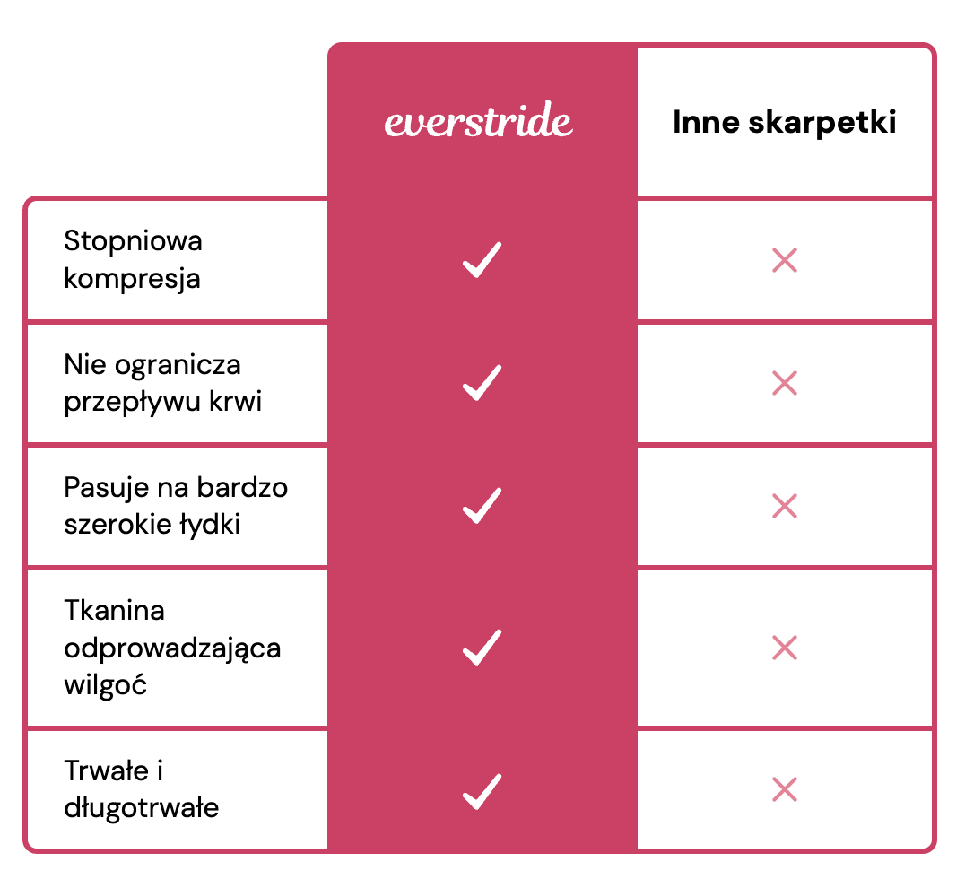 Skarpety uciskowe Everstride wykorzystują stopniowaną kompresję 15-20 mmHg w celu zwalczania obrzęków.