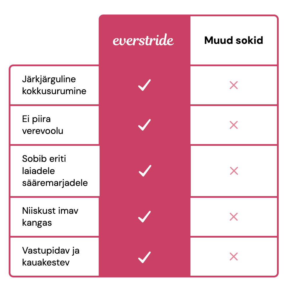 Everstride kompressioonsokid kasutavad turse vastu võitlemiseks 15–20 mmHg astmelist kompressiooni.