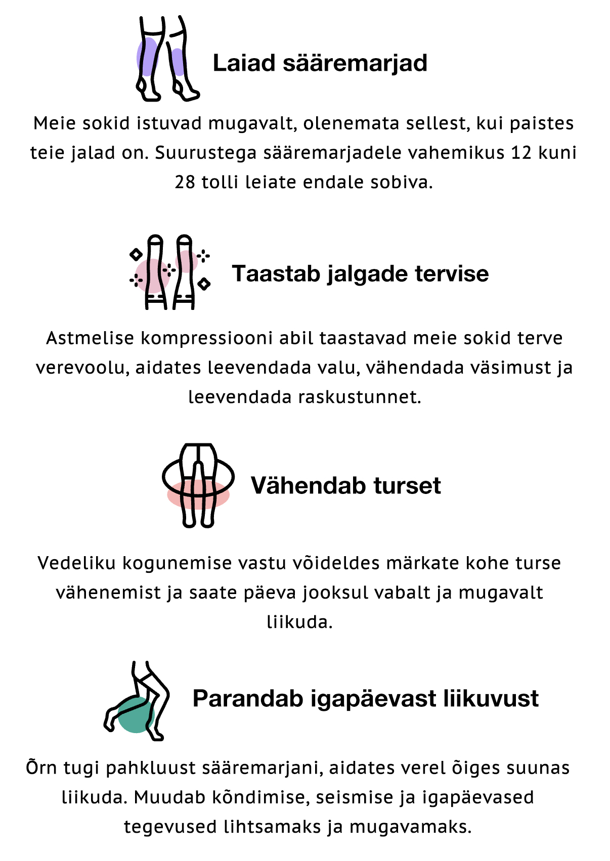 Meie sokid ümbritsevad õrnalt teie sääri ja stimuleerivad vereringet ilma liigse pingeta. Aitavad ennetada võimalikke terviseprobleeme, näiteks verehüübeid, pakkudes samal ajal mugavust terveks päevaks.